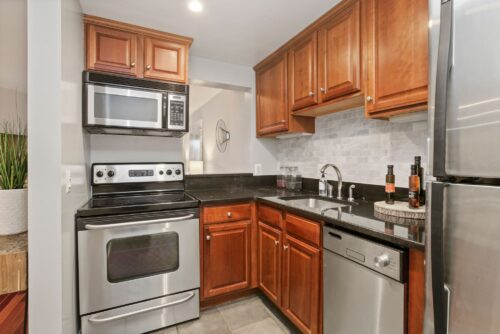 - Stainless steel appliances, granite counters and cherry wood cabinets in the light filled kitchen