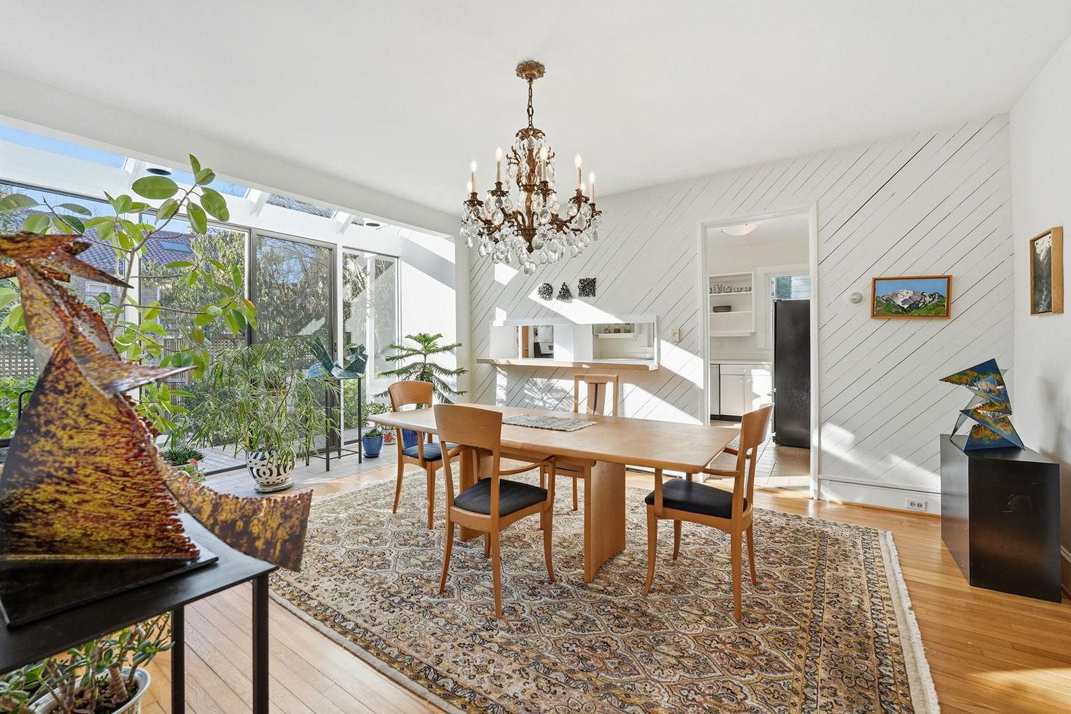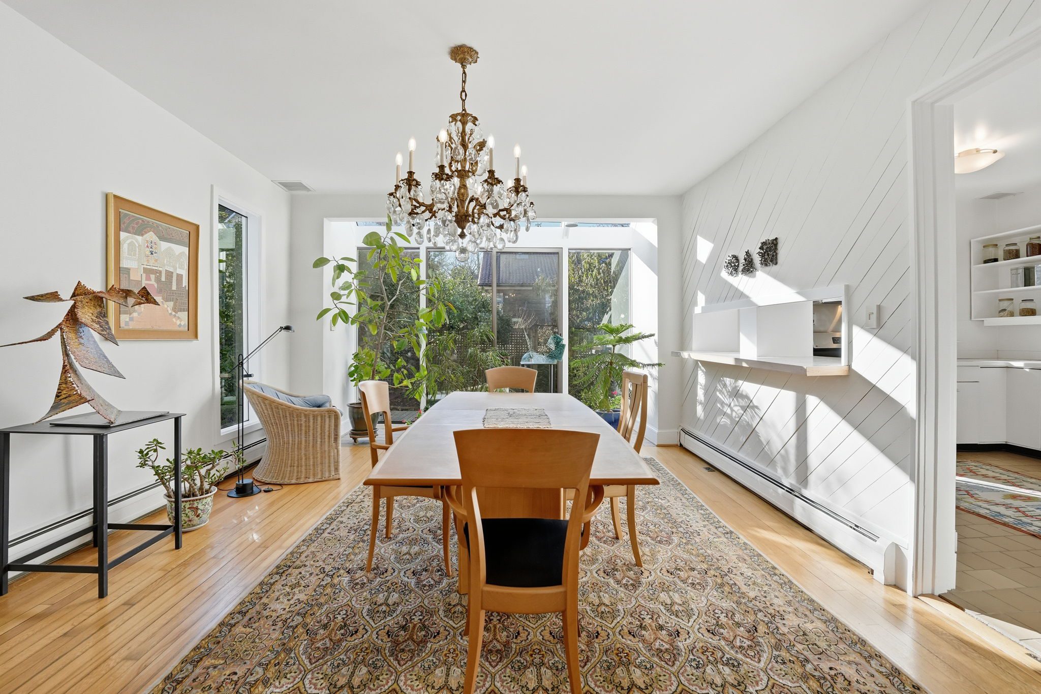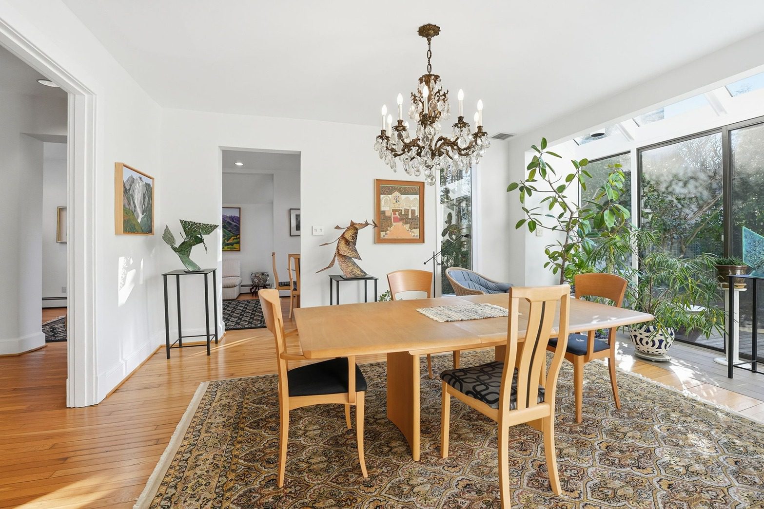 - Expansive dining room filled with southern light and a wall of glass overlooking the rear garden
