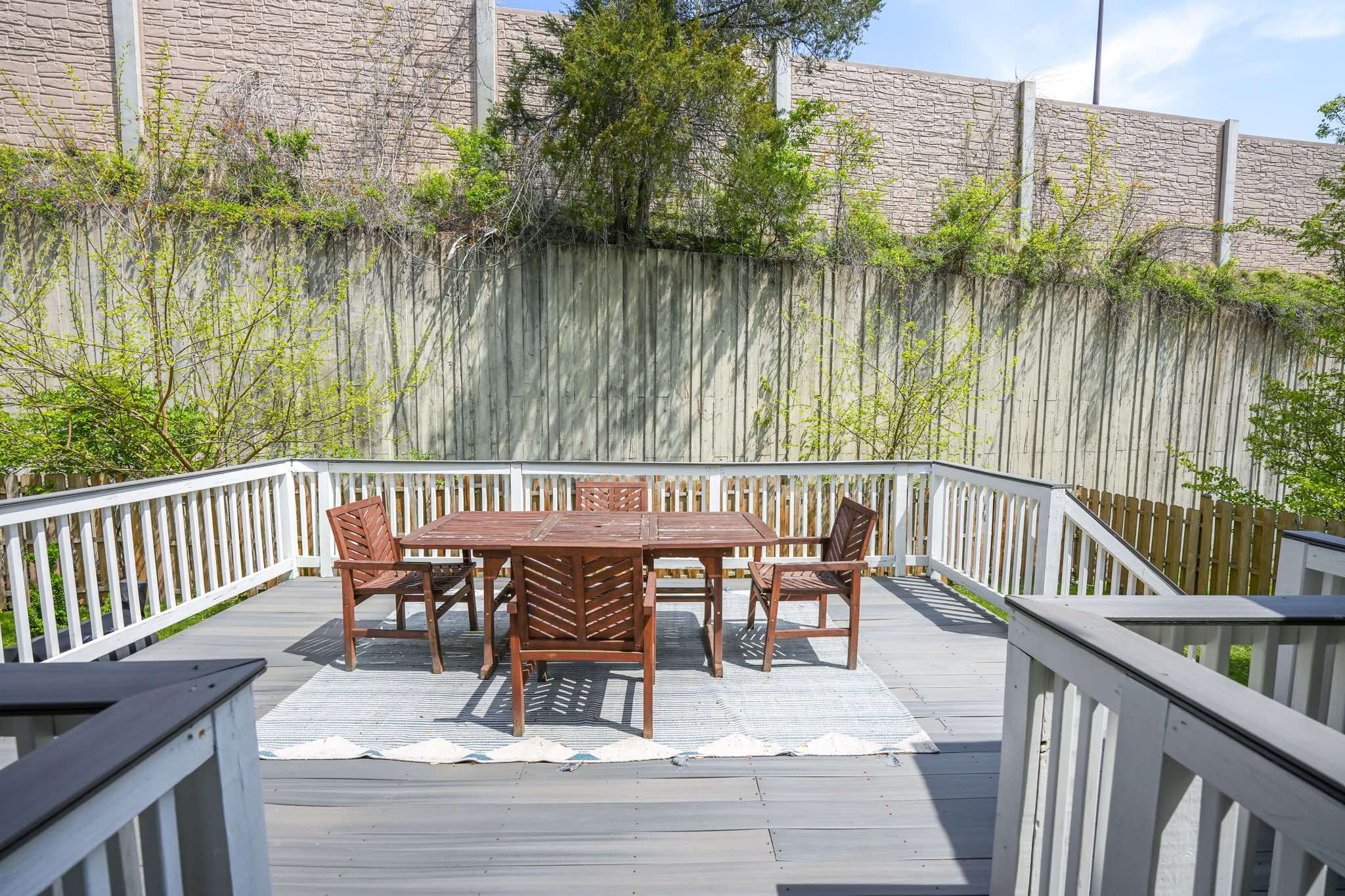 - Rear Trex deck with wood railings for outdoor dining or relaxing